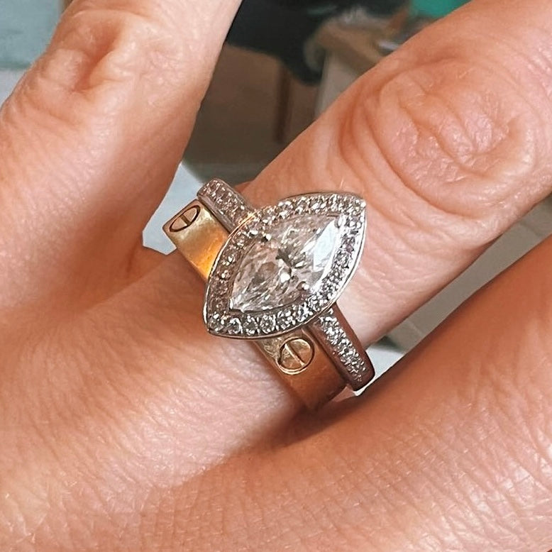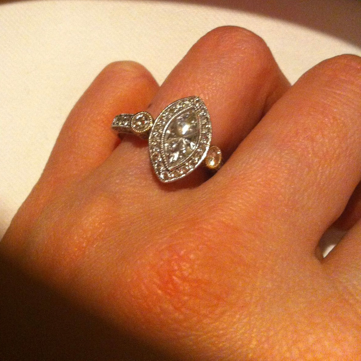 We went on the hunt for a replacement ring for her that would hopefully capture her heart in the same way that her previous one did. In the same day we found this Vintage 18ct white gold 0.71ct Marquise Diamond ring (image on the right) which insanely was in her size. Meant to be.