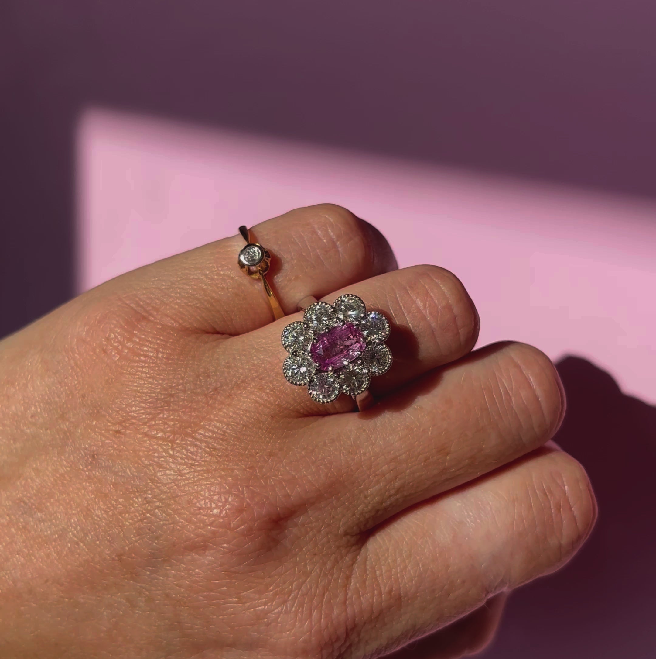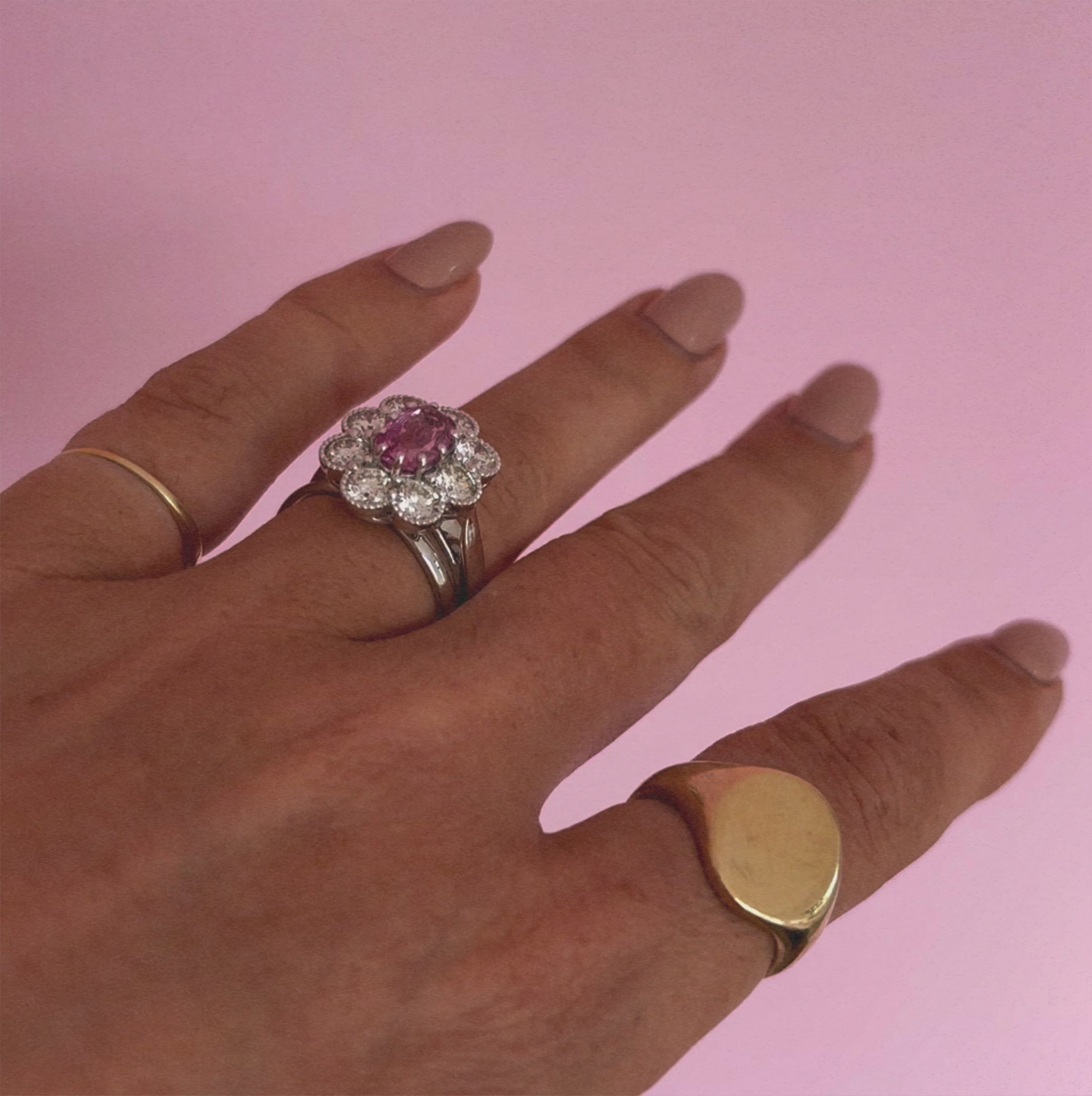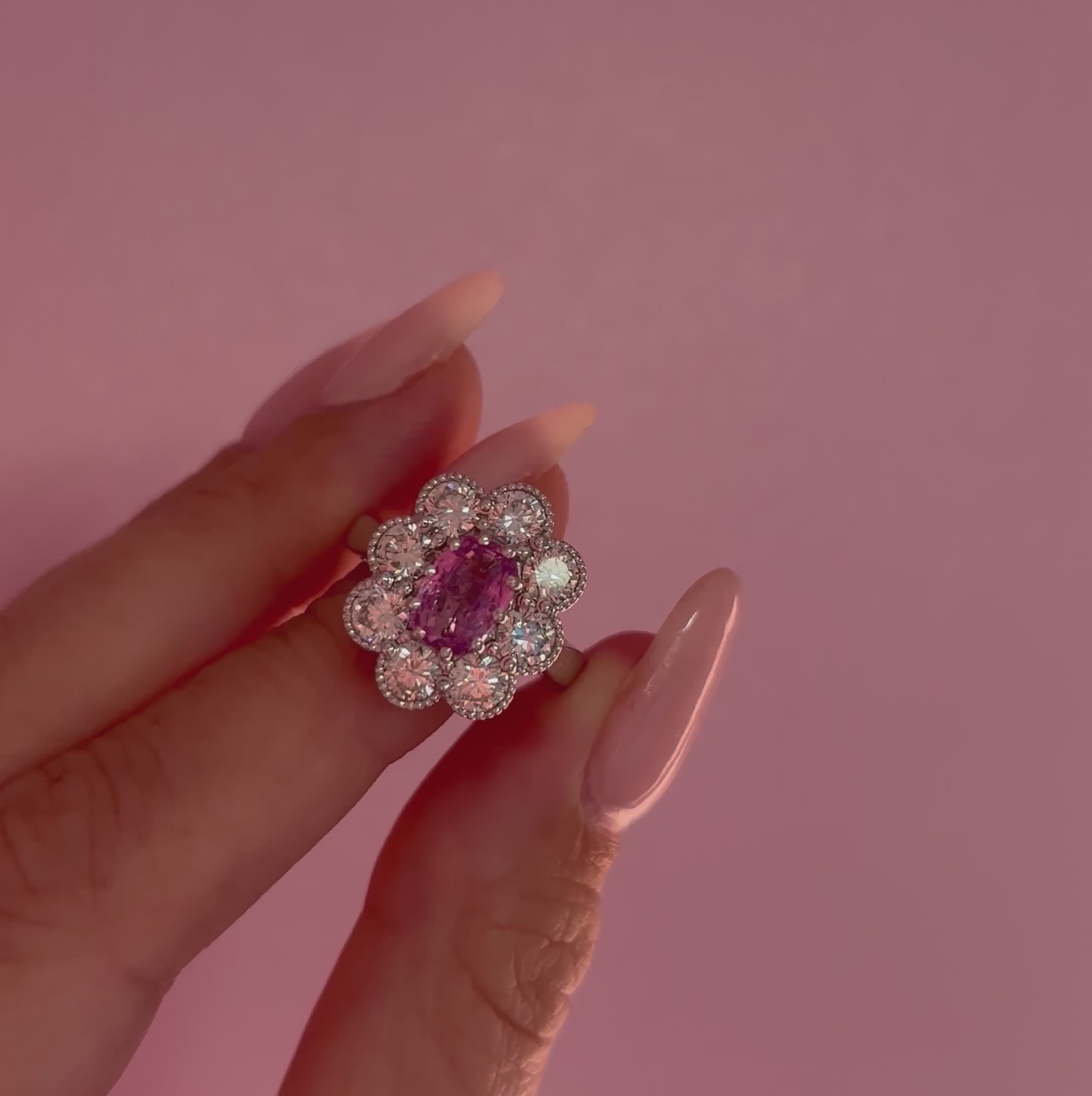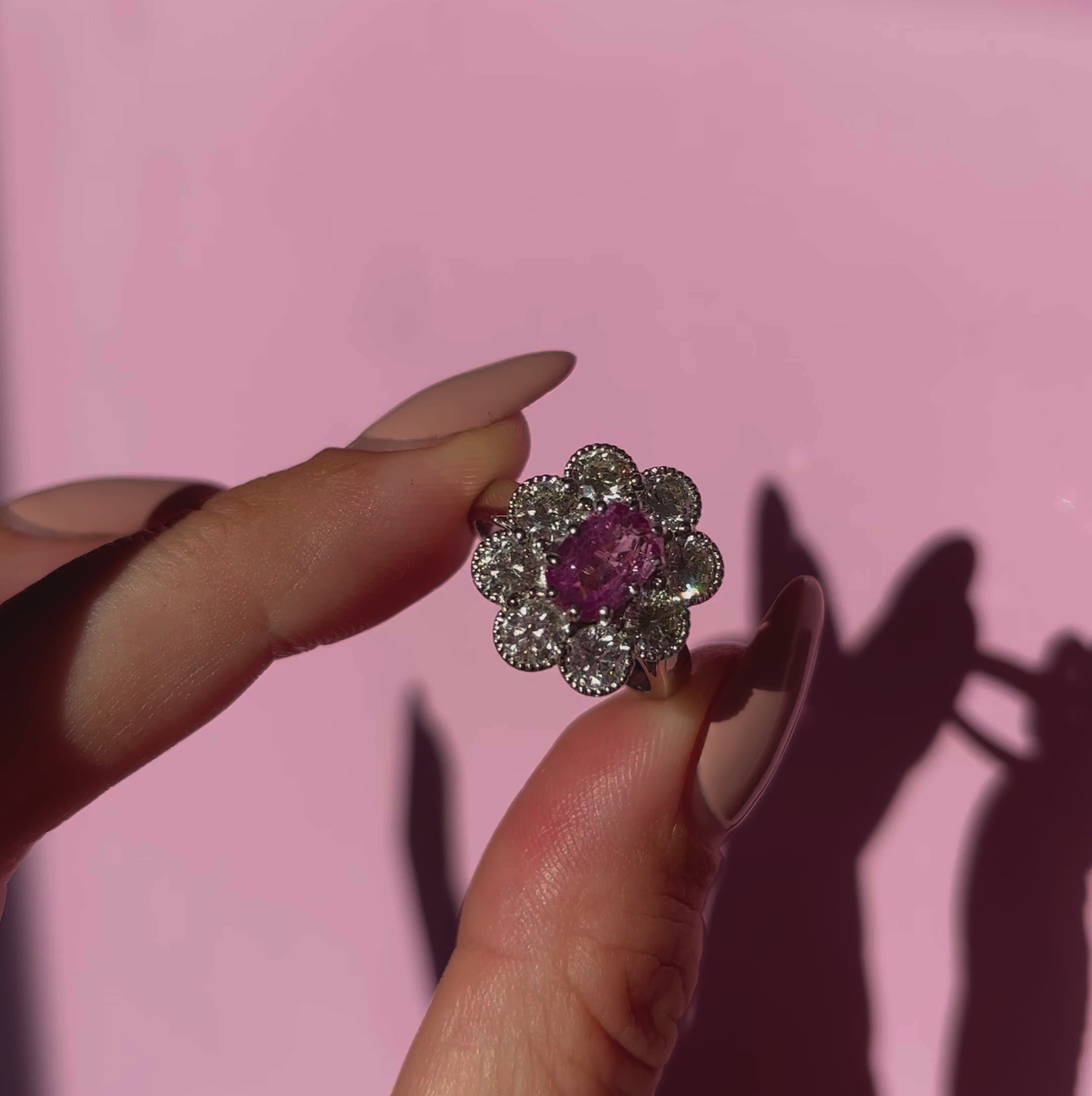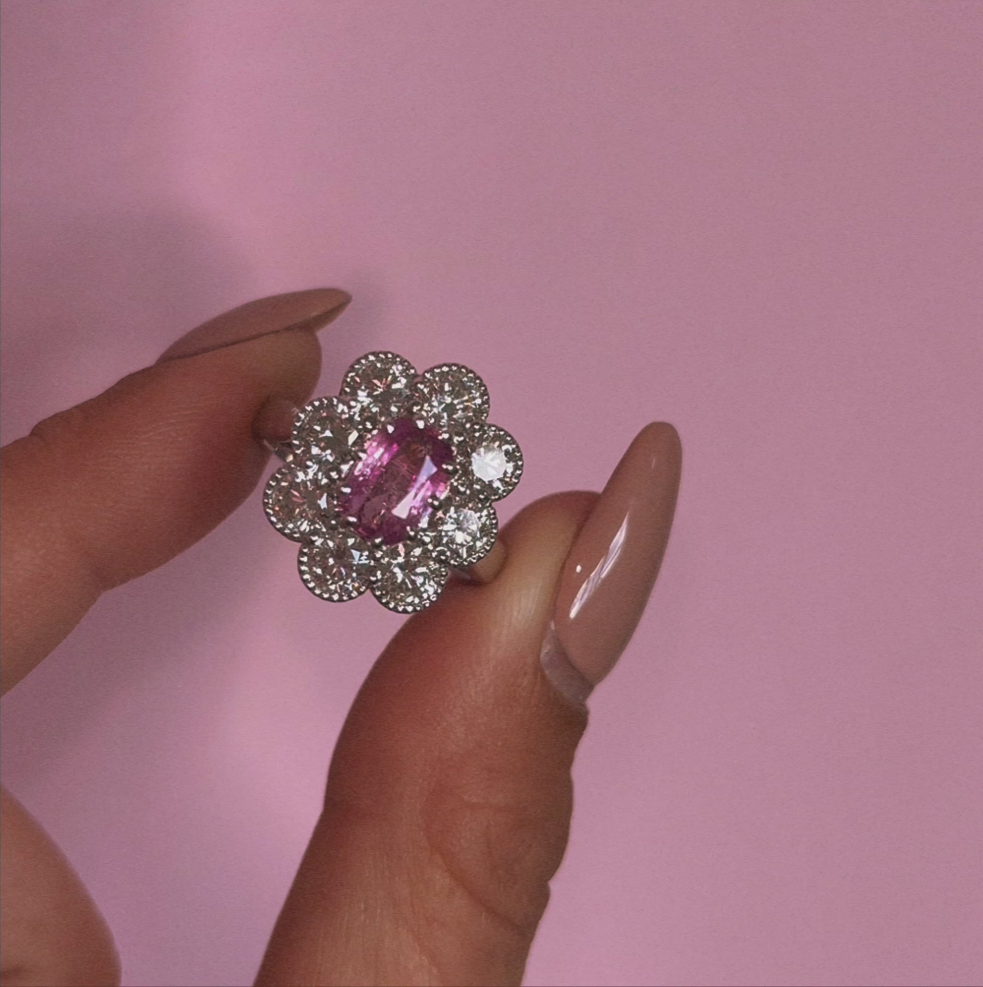18ct white gold 1.84ct pink sapphire and diamond cluster ring