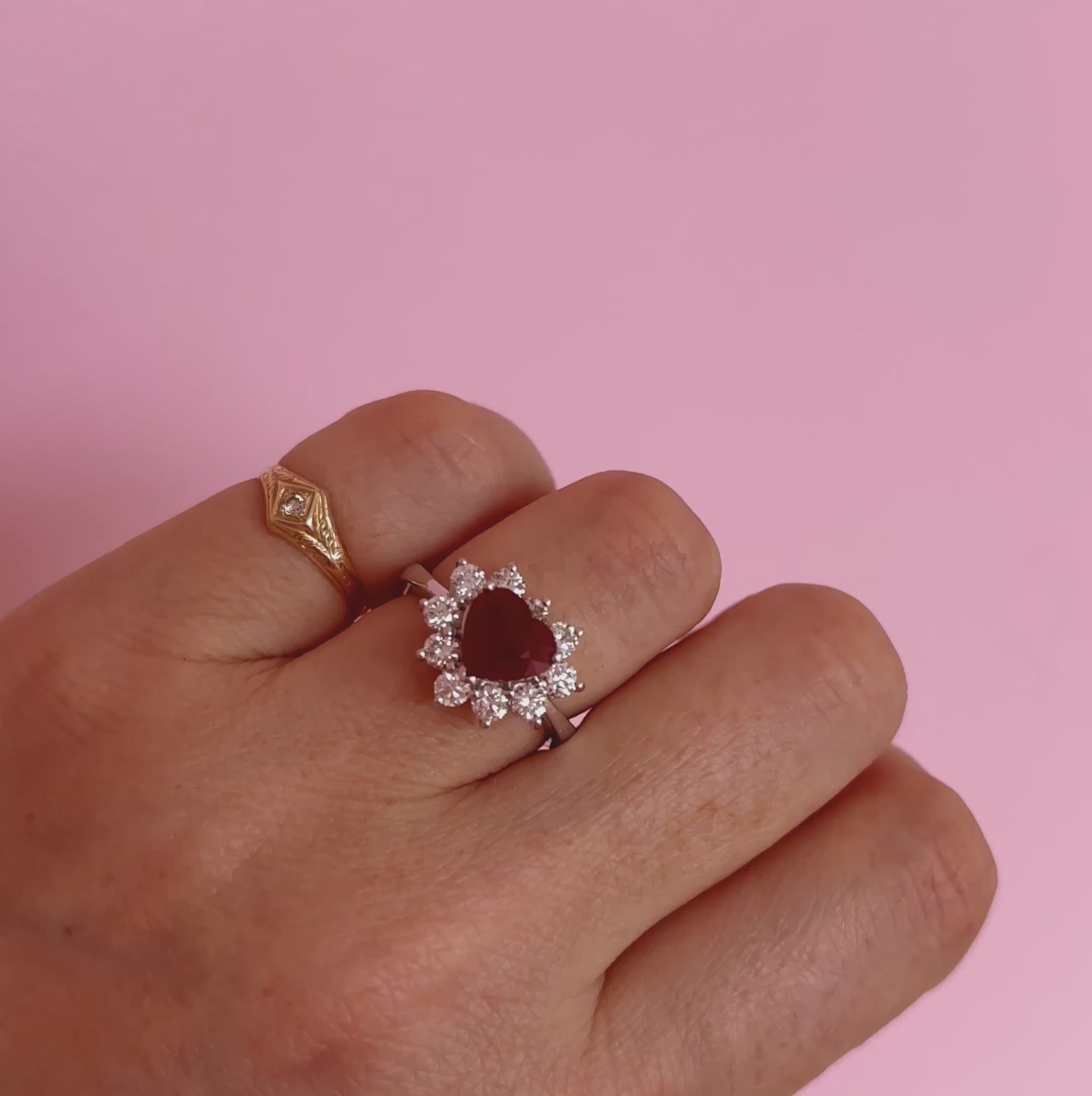 18ct white gold 1.61ct heart-shaped ruby and diamond cluster ring