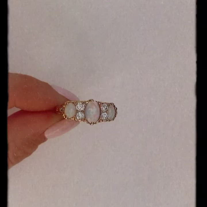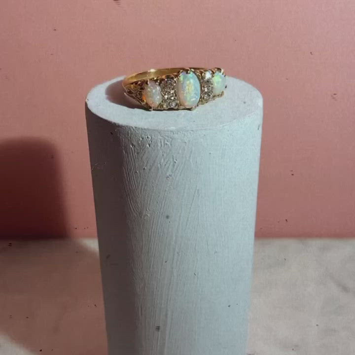 Solid 18ct gold ring set with three opals and four diamonds in a carved band.